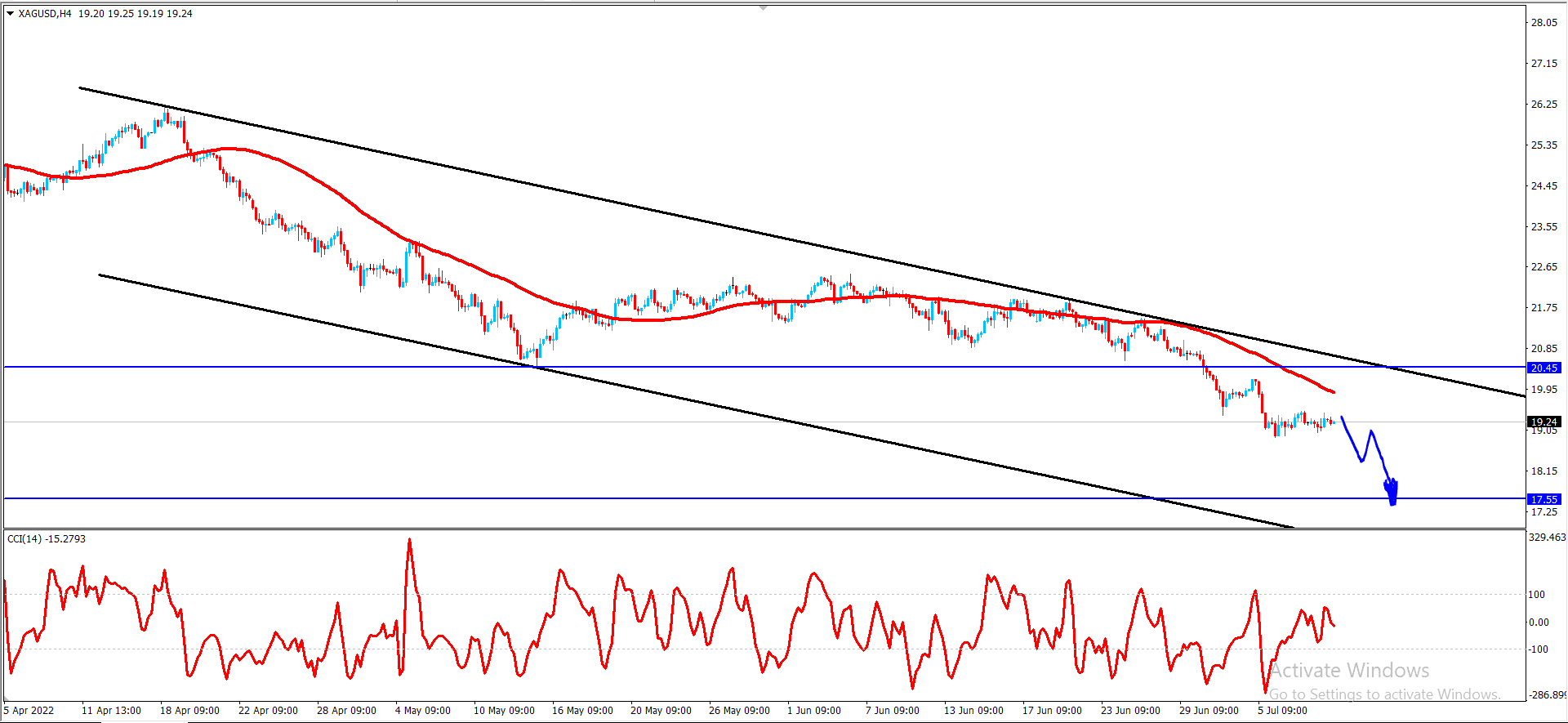 ونحن الان بانتظار مزيد من الانخفاض للتوجه نحو 18.60 الذي يمثل هدفنا التالي مع الانتباه إلى أن اختراق 19.60 سيوقف السيناريو السلبي ويقود السعر لبدء محاولات تعافي على المدى اللحظي.