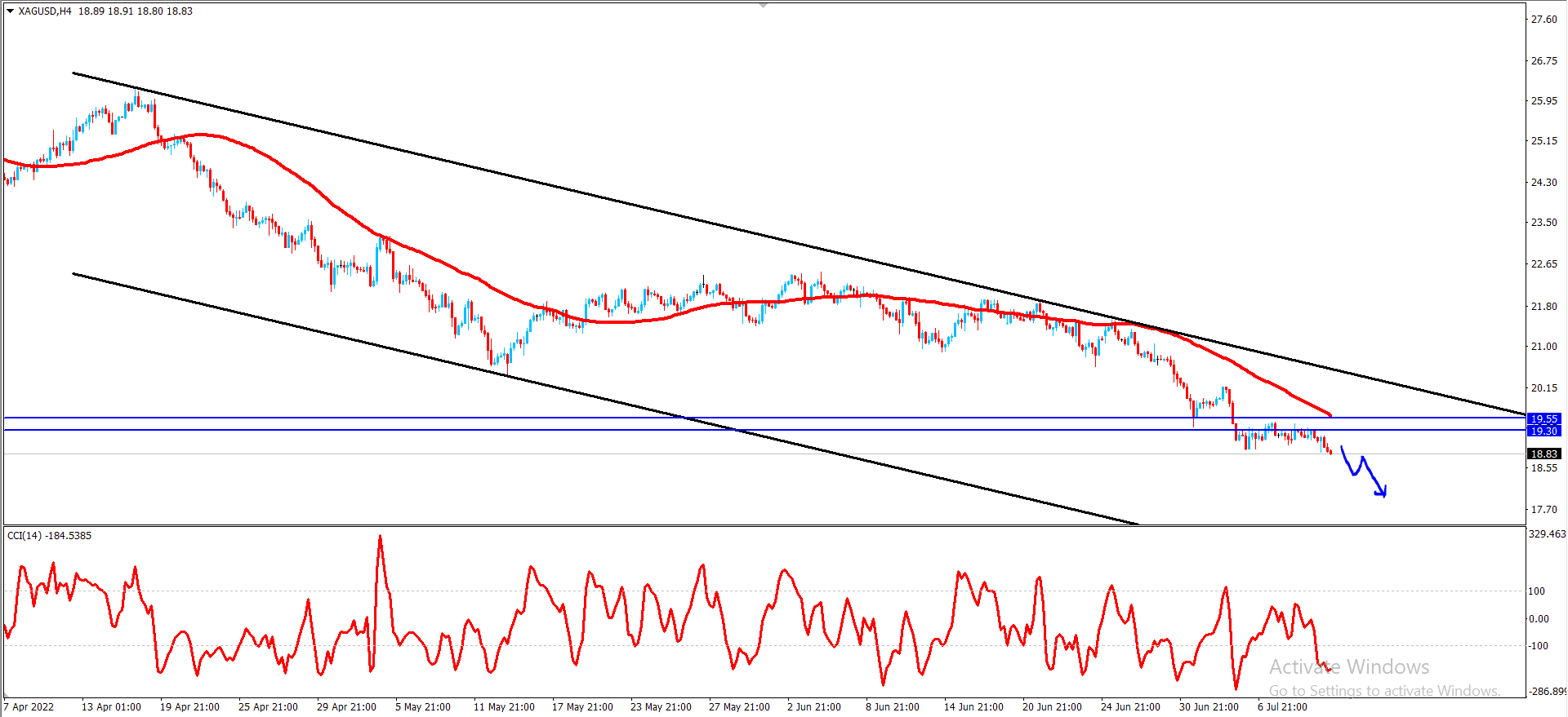 يستمر الان معنا سعر الفضة بتداولاته السلبية ليستقر اسفل مستوى الدعم 19.00 ويتحرك ضمن قناة لحظية هابطة تدعم التوقعات باستمرار الاتجاه الهابط خلال الايام القادمه الان