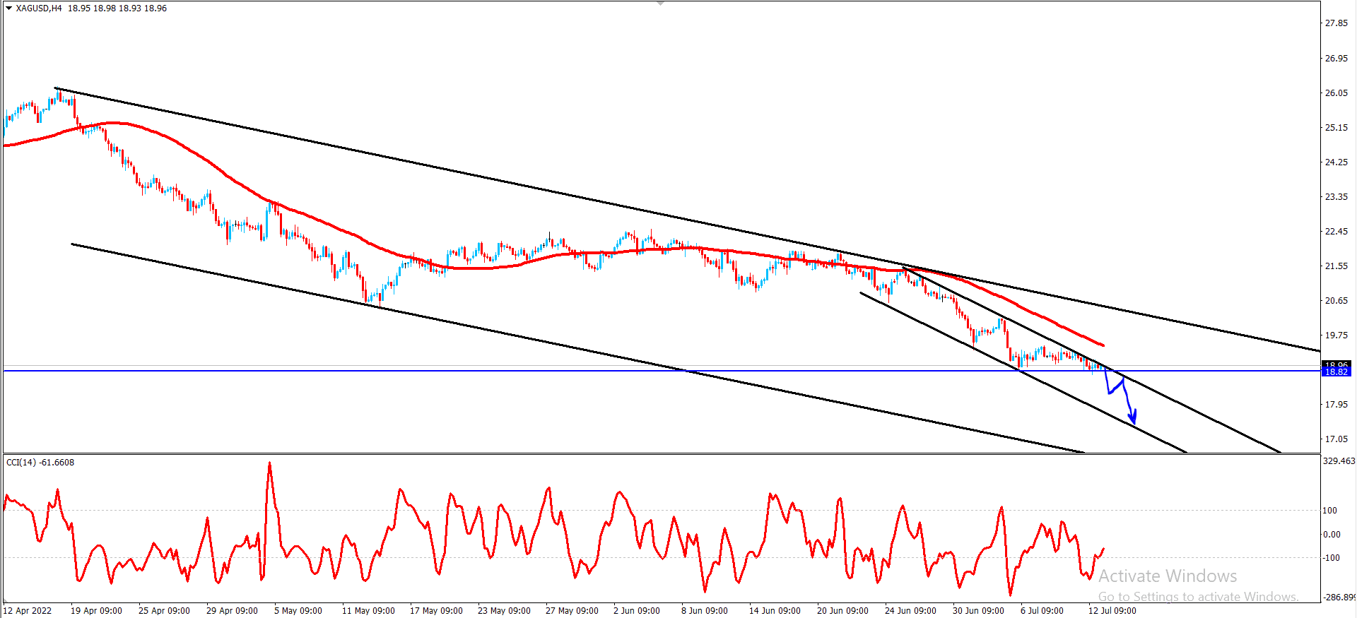 بمتابعه شارت الفضه الان كما نلاحظ الان يستأنف سعر الفضة تداولاته السلبية ليستقر اسفل مستوى 19.00 وكما نلاحظ يتحرك ضمن قناة فرعيه هابطة تدعم التوقعات باستمرار السيناريو البيعى الهابط