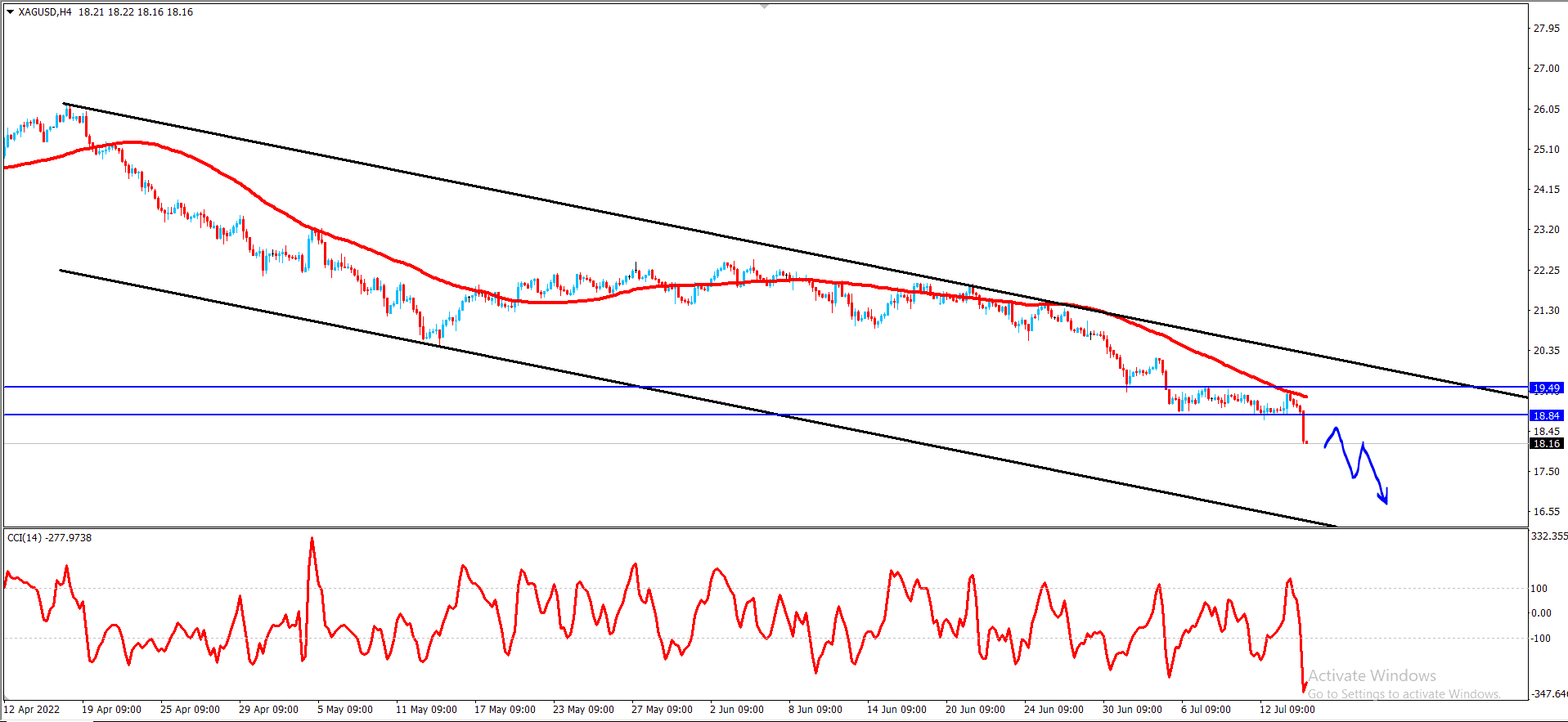 ظهور موجه هابطه عنيفه على شارت الفضة تبداولات سلبية جديدة ليتحرك دون 18.80 ليستهدف مستويات جديده عند سعر 18.14 لذالك فنحن مازالنا نتوقع استمرار الهبوط