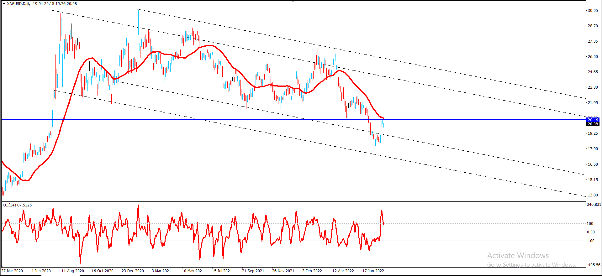 رغم التداولات الوراده مؤخرا بتكوين موجه صاعده على شارت الفضه نلاحظ الان على شارت الاربع ساعات يتذبذب سعر الفضة حول مستوى 20.00 ولا يزال اسفله الان وهوا مستوى مقاومه هام ولذالك فنحن الان بانتظار تفعيل التأثير الإيجابي لمؤشر السى سى اى