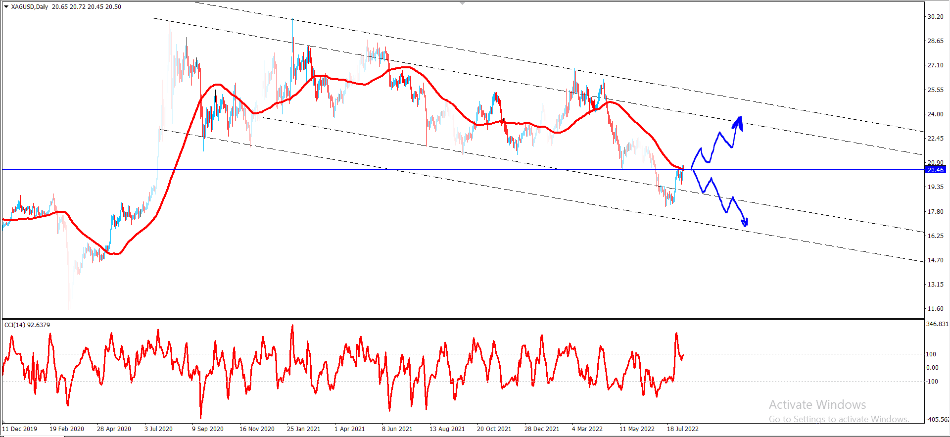 استمرار السيناريو العرضى بميل ايجابى على شارت الاربع ساعات كما نلاحظ الان تستقر تداولات سعر الفضة اعلى مستوى هام عند سعر 20.50