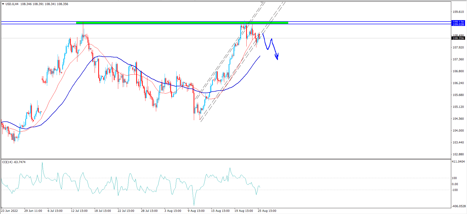 على الشارت المرفق اعلاه نلاحظ الان تأجيل الهجوم الصاعد وتشكيل تداولات سلبية لحظية ليستقر بذلك قرب 108.20 نذكر بأن الاستقرار العام ضمن محاور القناة الصاعدة وبمحاولة تشكيل مستوى 107.90
