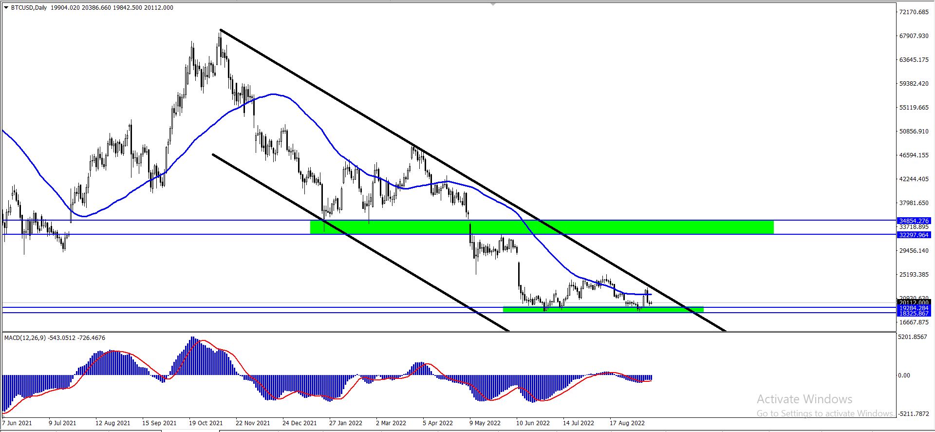 استمر الضغط البيعى على شارت المرفق اعلاه للبتكوين لنلاحظ الان وصول الاسعار الى مستوى دعم يومى هام كما نلاحظ بالشارت المرفق اعلاه ومازال البتكوين يارجح في نطاق ضيق ما بين مستوى 20110 ومستوى 21670 مقتربا بذلك من المستوى الاخير وسوف يتحدد الاتجاه القادم للعملة باختراقه احد المستويين المذكورين اما باستمرار الهبوط الى قيعان جديده