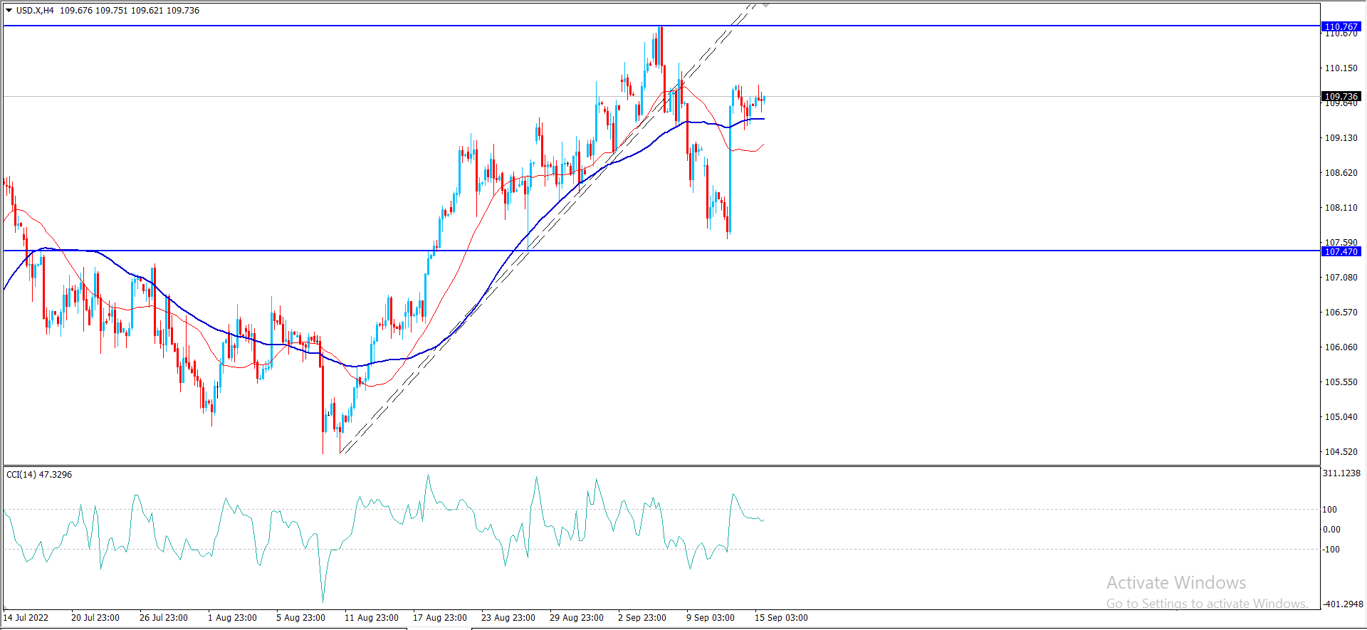 تداول ملحوظ على سعر المؤشر المسار الصاعد بتجميعه للعزم الإيجابي باقتراب مؤشر السى السى اى من مستوى 80 لنلاحظ تشكيله حاليا لاندفاع صاعد محققا بذلك لمستوى 109.80