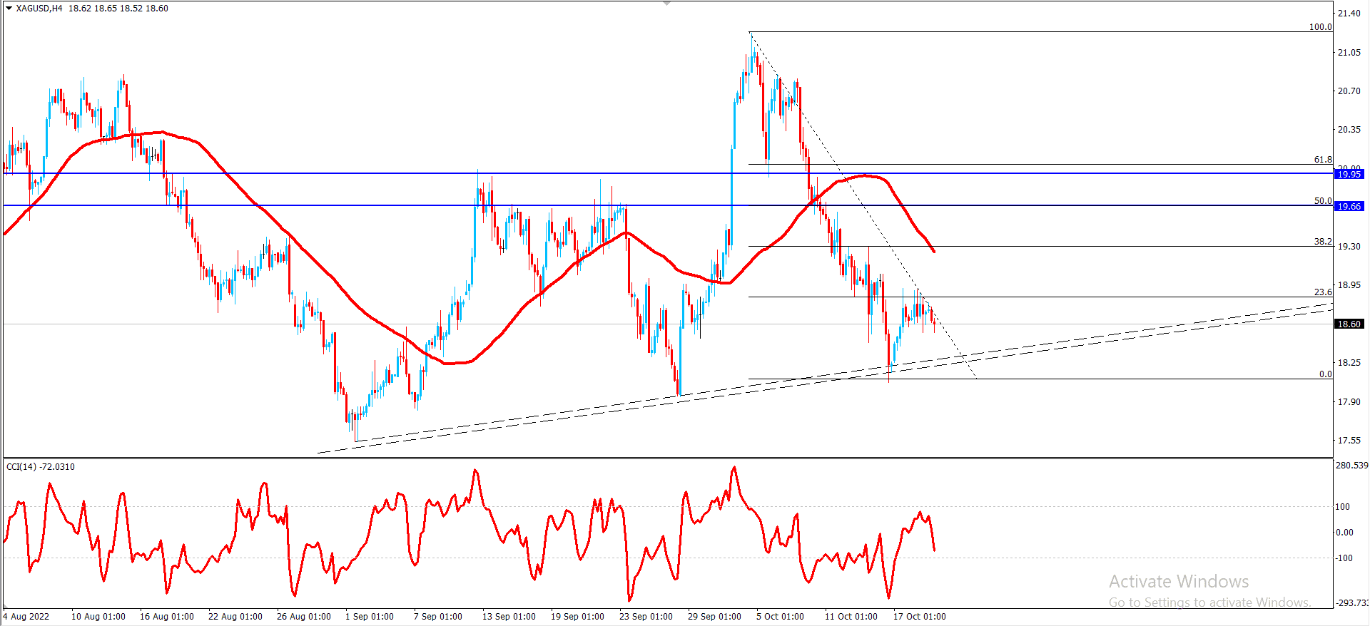 على شارت الاربع ساعات يستمر سعر الفضة بالتحرك حول مستوى هام عند سعر 18.80 ولا يزال دونه حتى الآن، مما يشجّعنا على الاحتفاظ بتوقعاتنا للاتجاه الهابط خلال الايام القادمه