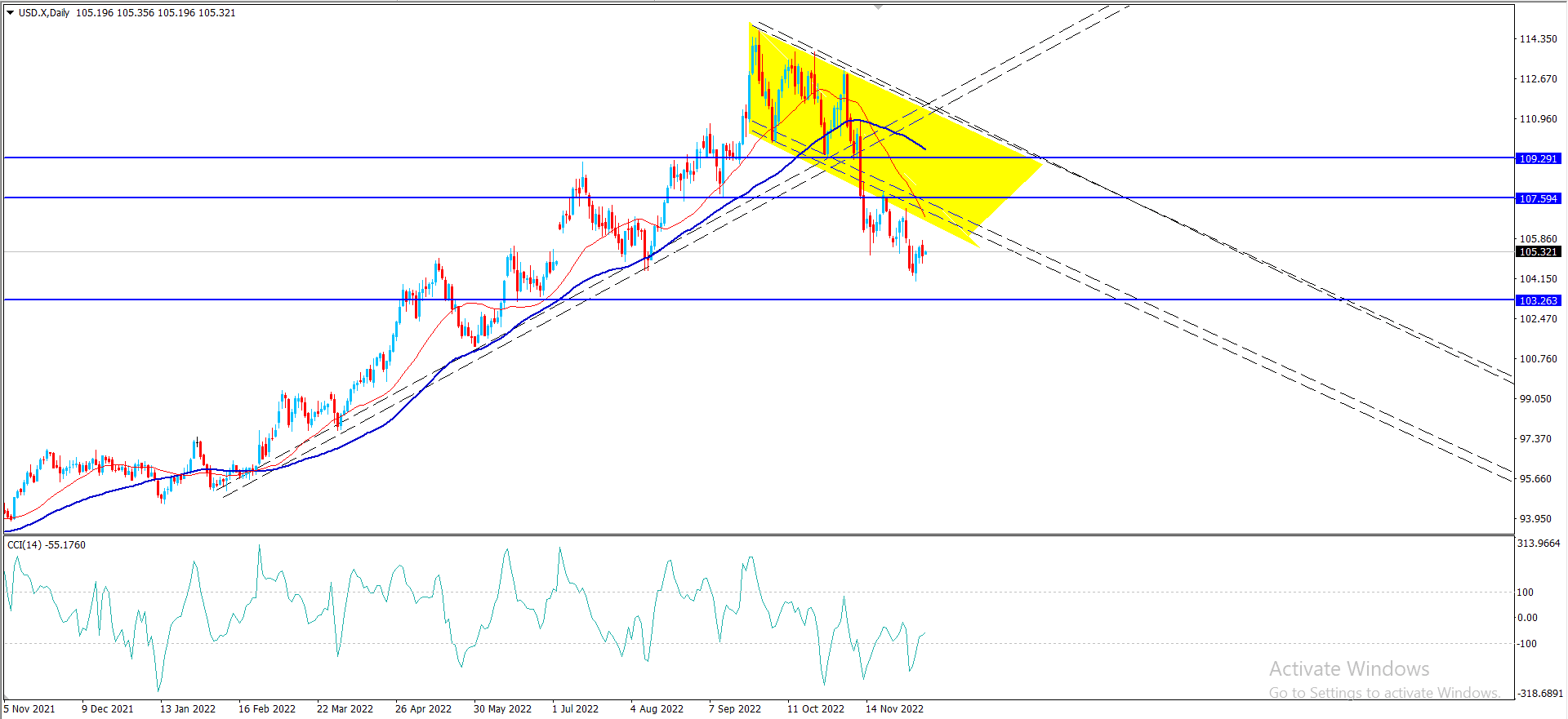 كما نلاحظ الان على شارت مؤشر الدولار مزيد من الميل الهابط ليبتعد بذلك عن مستوى 103.95 وليسجل بعض المكاسب بوصوله نحو 105.60