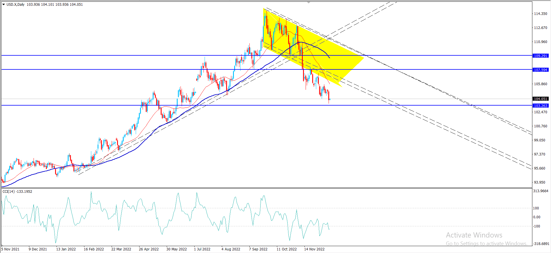 بنتابعه المؤشرات الفنيه الان نلاحظ محاولة تقديم مؤشر السى سى اى للعزم السلبي سيزيد من فرص هبوط التداولات قريبا نحو العائق المتمركز عند 103.95 ومنها نلاحظ حافظ سعر المؤشر على تمركزه السلبي دون الحاجز الإضافي المستقر عد 105.50