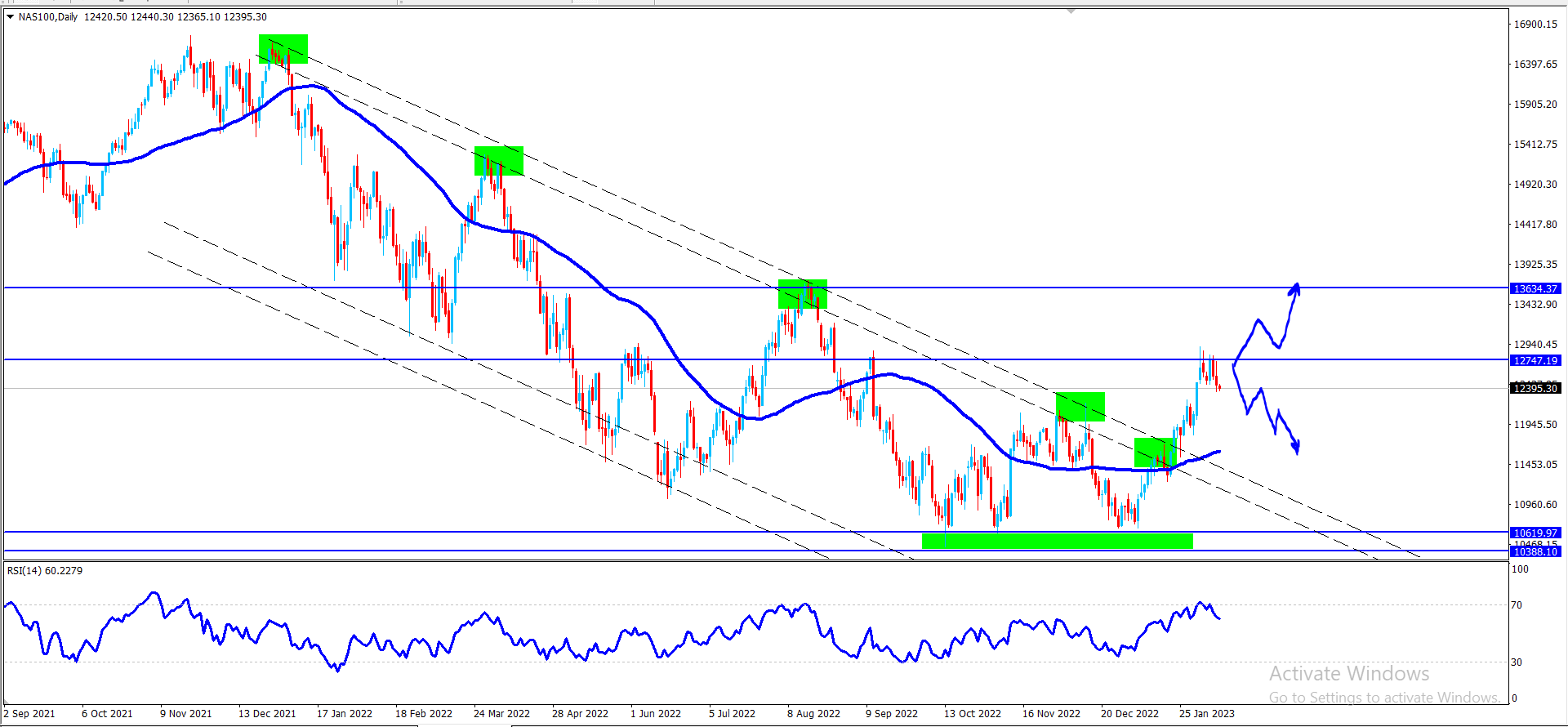 استمر معنا الان تقديم مؤشر الار اس اى للعزم السلبي مما يعطيا اشاره لزياده فرص تحقيق السعر لكسر مستوى الدعم اليومى الهام عند سعر 12310.00 وهذا يدعونا لترجيح المزيد من السلبية للفترة القريبة وليشكل مستوى 12110.00 الهدف التالي للفترة الحالية.