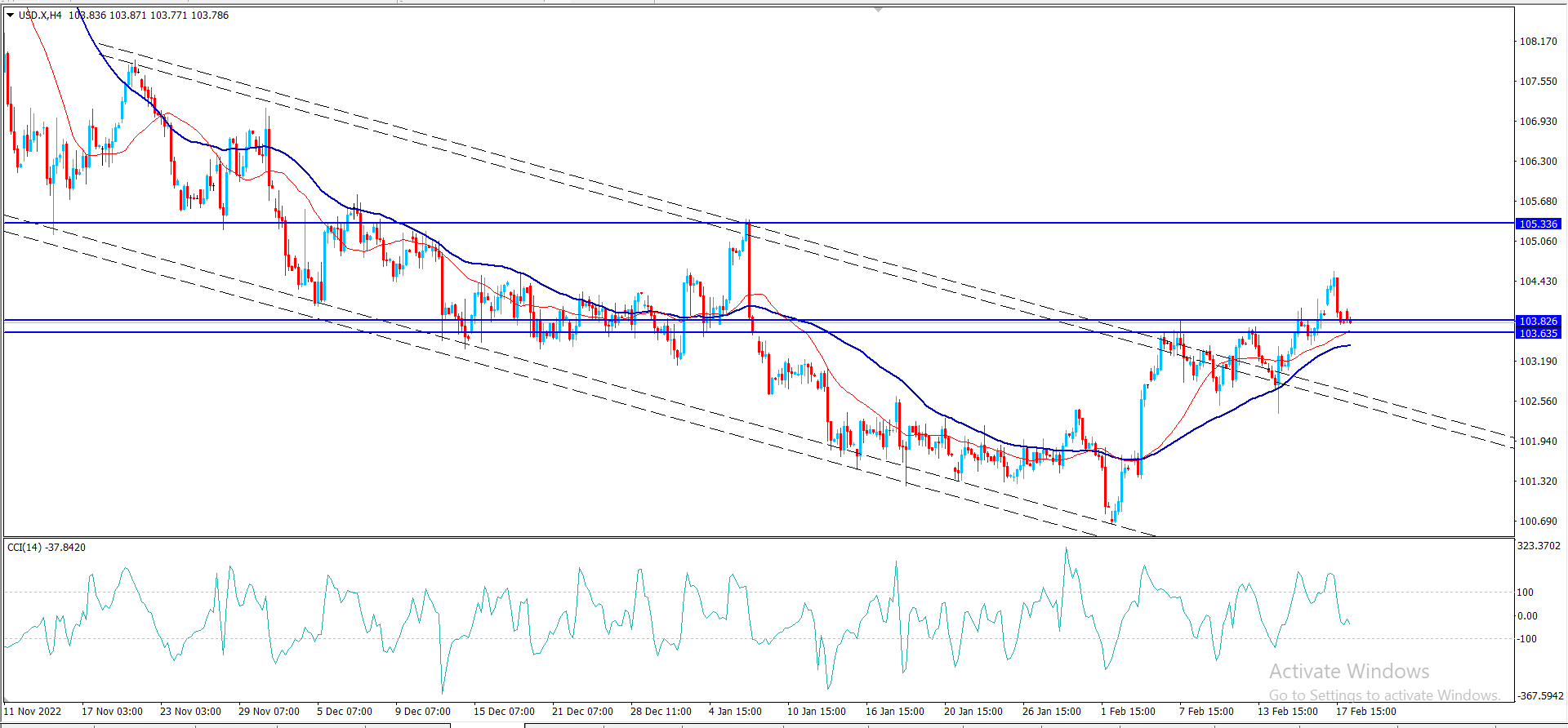 تداولات سلبيه على شارت الاربع ساعات الان بعد اختراق القناه الهابطه على الشارت المرفق لنلاحظ منها وصول الاسعار الى مستوى 103.80 لاعاده الاختبار واخذ العزم الازم