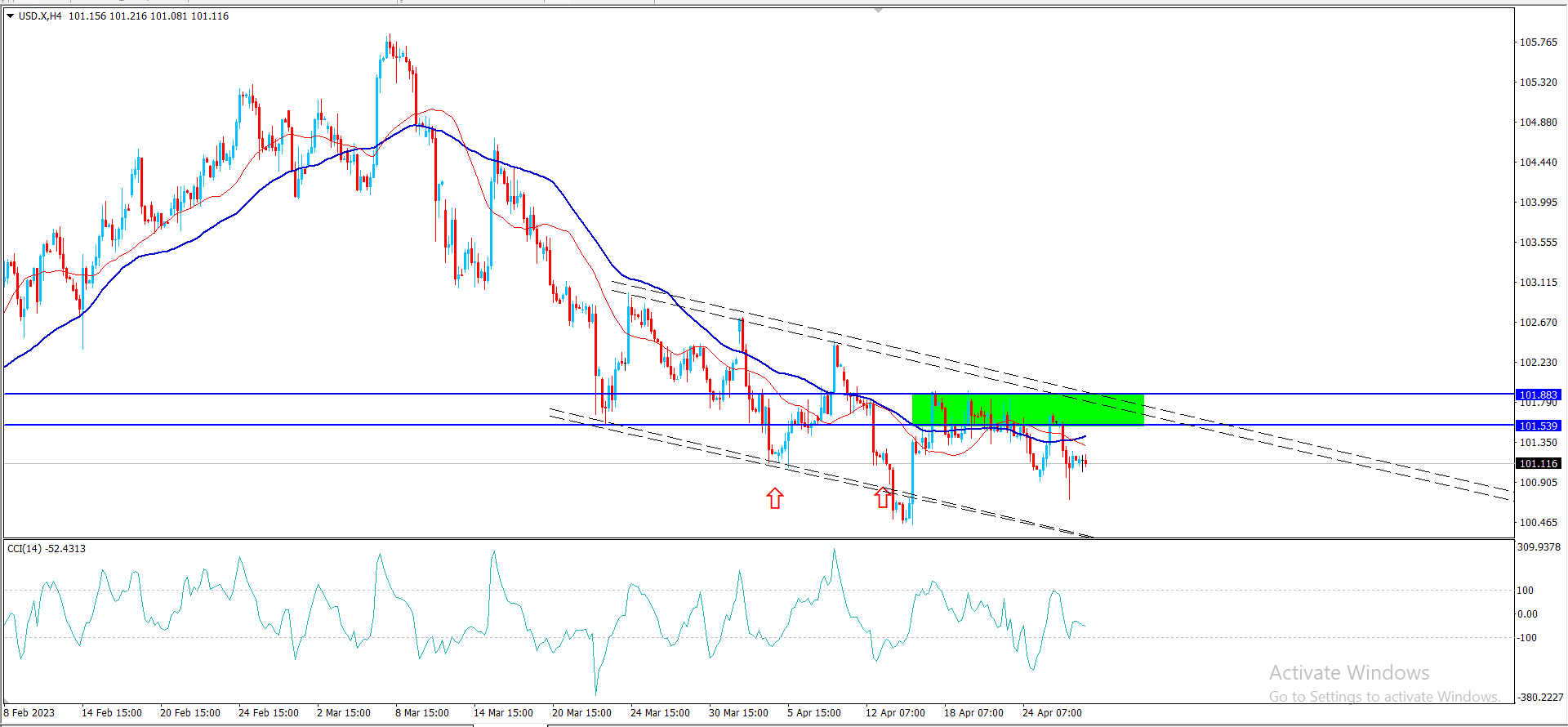 علما باننا نلاحظ الان تمركز التداولات بشكل عام ضمن محاور القناة الهابطة وباستمرار تشكيل مستوى 102.10 للحاجز الإضافي, فإن هذه العوامل تدعونا للاستمرار بترجيح المحاولات السلبية لينجح السعر بكسر مستوى 100.65 والوصول نحو المحطات السلبية الإضافية بدأ من 100.00 و99.35 على التوالي.