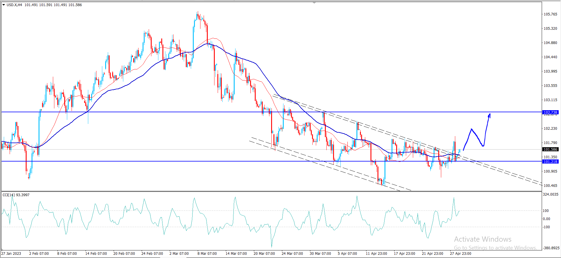 أما الثبات العام ضمن محاور القناة الهابطة واستمرار تشكيل مستوى 102.10 للحاجز الإضافي فإن هذه العوامل تدعونا لانتظار تجميع السعر للعزم السلبي خلال الفترة القريبة ليسهل ذلك مهمة تجديد الهجوم السلبي وتحقيق كسر للدعم الإضافي المذكور سابقا.