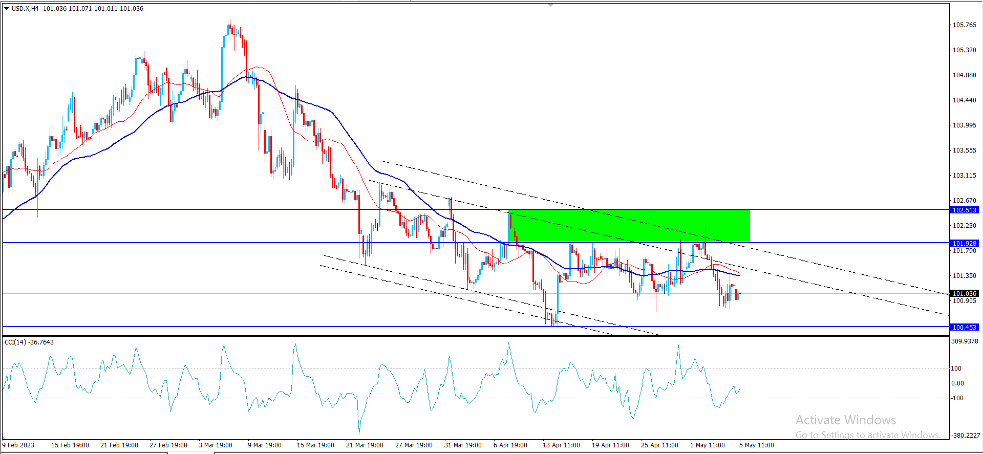 تداولات سلبية على شارت المرفق اعلاه تكررت معنا على سعر المؤشر تقديمه باستقراره ضمن محاور القناة الهابطة لنلاحظ تذبذبه مجددا قرب الدعم الإضافي المتمثل بمستوى 100.65
