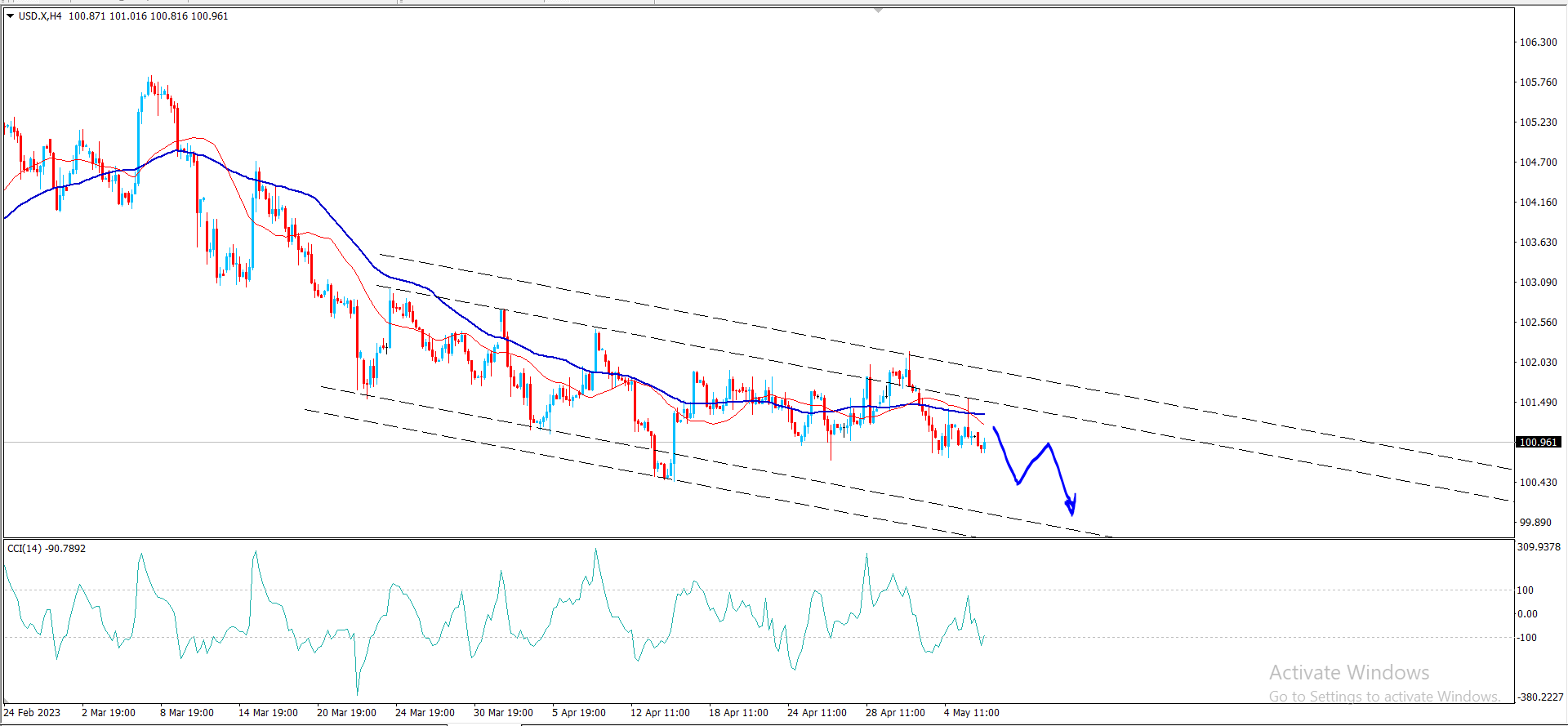 نلاحظ الان من خلال الشارت المرفق اعلاه استمر سعر المؤشر بالزحف السلبي ليحافظ بذلك على تمركزه ضمن محاور القناة الهابطة مستقرا بذلك قرب 100.90
