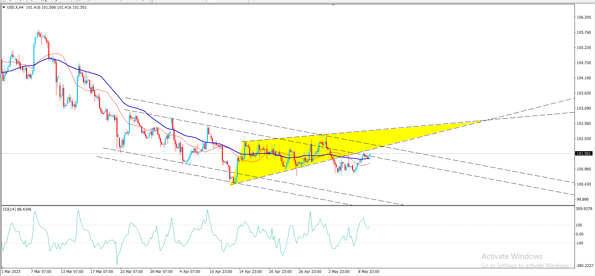 على شارت الاربع ساعات الان لا تغيير على تحرك الاسعار على مؤشر الدولار الهابط حتى هذه اللحظة نظرا لتذبذبه المتكرر ضمن محاور القناة الهابطة لنعتمد على ثبات المقاومة الرئيسية المتوقعه معنا حاليا نحو 102.15 تقريبا.