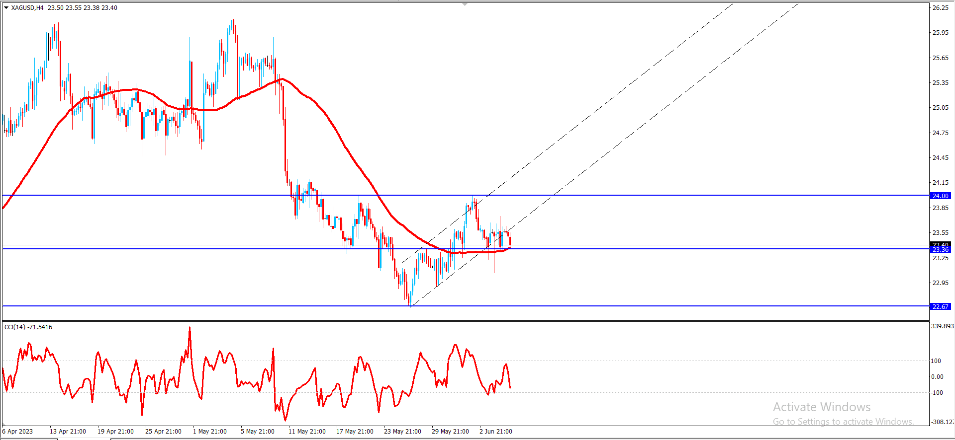 محاولات عديدة على شارت الفضه الان تتحرك بشكل واضح داخل نموذج القناه الصاعده ومنها نجحت الفضه فى كسر دعم القناة الصاعدة ليدعم التوقعات باستمرار الاتجاه الهابط خلال الايام القادمة مع التذكير بأن هدفنا التالي يتواجد عند 23.00.