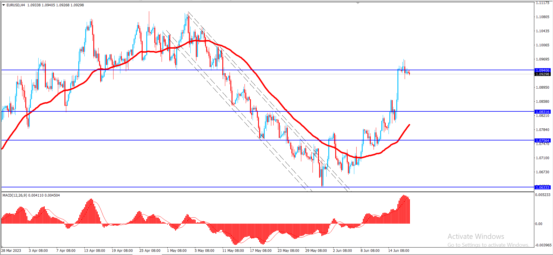 موجه صعود قويه على شارت الاربع ساعات تكونت معنا على زوج اليورو امام الدولار ليصل معنا الى مستوى مقاومه يومي هامه لكن كما نلاحظ لم يتم اختراقه ووجد صعوبة في تأكيد تخطي مستوى 1.0940،