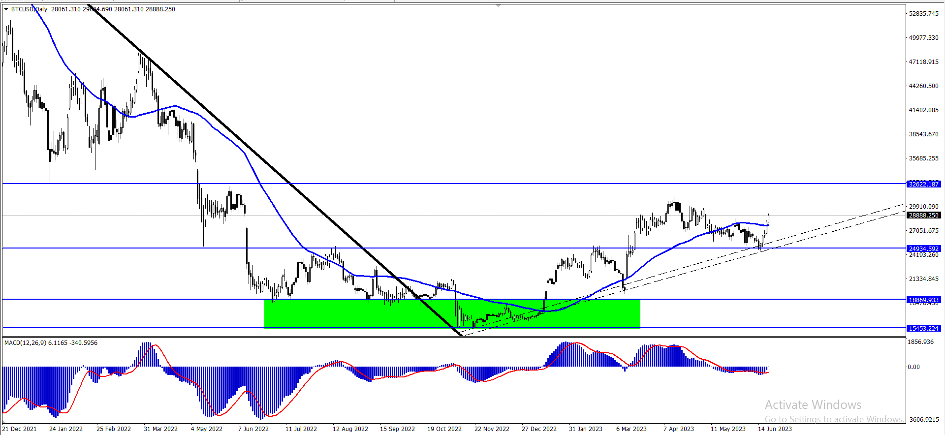 لنلاحظ الان على شارت الاربع ساعات يتجه نحو استعادة الاتجاه الرئيسي الصاعد من جديد، في طريقه لتحقيق مكاسب جديدة تبدأ عند 29255.00 وتمتد إلى 30000.00 بعد تخطي المستوى السابق.