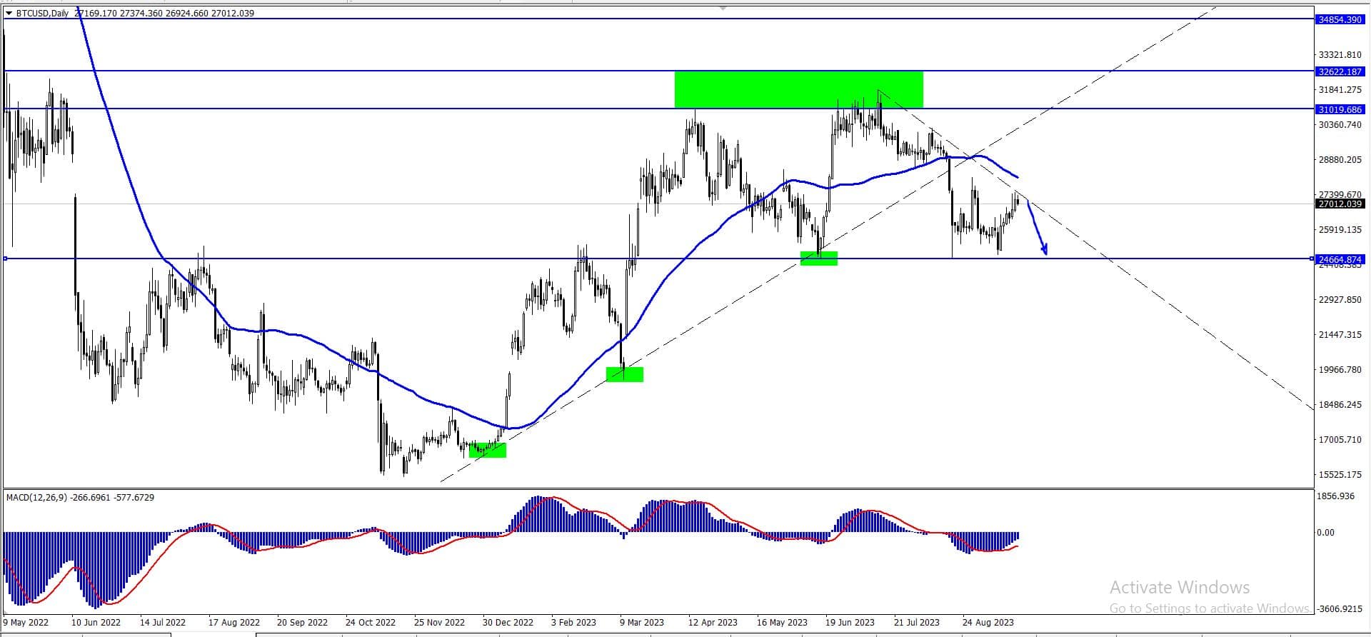 كنا نوهنا فى تقريرنا الاخير عن هبوط الاسعار وكسر الترند الصاعد على شارت البتكوين ومنها نلاحظ الان تمكن سعر البتكوين من تحقيق هدفنا الأول المنتظر عند 27475.00 ووجد مقاومة قوية هناك، ليظهر بعض الميل الهابط المؤقت،