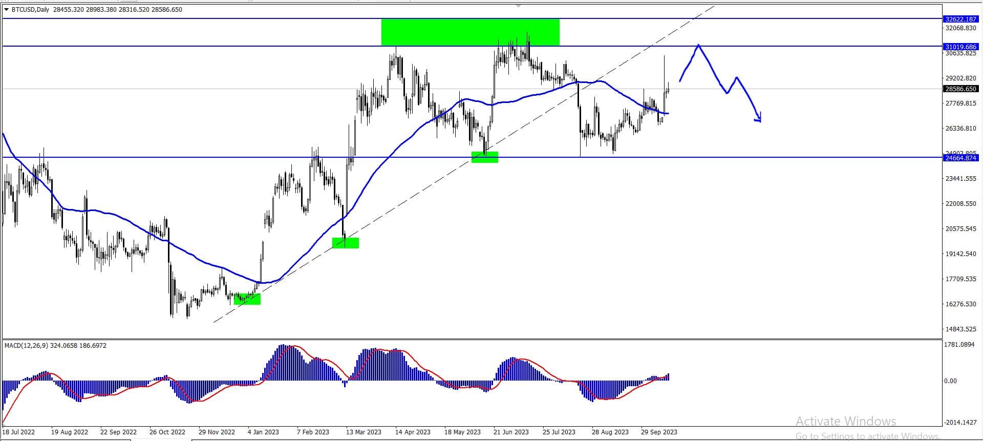 تحرك الاسعار على سعر البتكوين نحو الصعود أمس ليحافظ على ثباته اعلى مستوى 28324.70، مما يبقي على سيناريو الاتجاه الصاعد قائماً للفترة القادمة يدعمه المتوسط المتحرك 50،مع الانتباه الى ان أهدافنا المنتظرة تبدأ عند 29255.00 وتمتد إلى 30000.00.