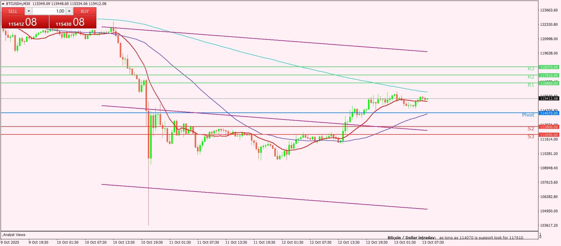 طالما أن مستوى 114070 يشكل دعمًا قويًا، يُرجّح استمرار الزخم الصاعد مع استهداف 117610.