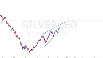 المضارب العربي / نموذج الوتد الصاعد علي الفضة ارتفع مؤشر عقود الفضة نسبة 0.92٪ ليصل إلى 17.35 دولار للأونصة في وقت متأخر من يوم الجمعة، نلاحظ تكوين القاع أعلي مستويات 16 دولار بقليل علي فريم الساعة ومحاولة السعر الصعود. كذلك يظهر النموذج الفني الانعكاسي الوتد الصاعد. فرصة للبيع بهدف في حال…