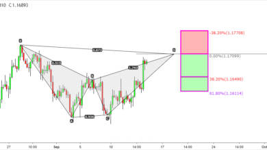 المضارب العربي / نموذج الهارمونيك Bat علي زوج EURUSD ارتقع زوج اليورو دولار علي اثر قرارات المركزي الاوروبي وأوشك علي انهاء نموذج الهارمونيك البيعي Bat. علي فريم الاربع ساعات السعر يبدو أنه استأنف الاتجاه الصاعد لذلك لا نتوقع هبوط السعر. ننتظر حركة تصحيحية صغيرة قد لا تتجاوز 38.2 % من الموجة…