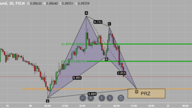 المضارب العربي / نموذج الهارمونيك Bat علي زوج EURGBP انهار اليورو أمام الاسترليني في الساعات الأخيرة حيث يتجه نحو انهاء نموذج الهارمونيك الشرائي Bat. السعر قام بتكوين قمة أدني من قمة سابقة وكسر الدعم 0.8970 بشمعة ابتلاعية. نتوقع استمرار الهبوط علي الأقل نحو منطقة الانعكاس المتوقعة لنموذج الهارمونيك.