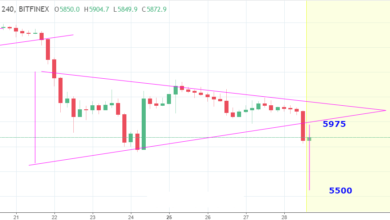 المضارب العربي / نموذج المثلث المتماثل علي البيتكوين هبط البتكوين تحت مستوي الستة آلاف دولار في تداولات يوم أمس الخميس بعد ان استطاع الثبات أعلي هذا المستوي النفسي الهام طيلة الاسبوع. علي فريم الاربع ساعات كسر السعر نموذج المثلث المتماثل. نتوقع استمرار الهبوط ونوصي بالبيع من المستويات الحالية بهدف مستوي 5500…
