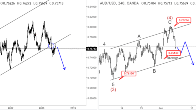 المضارب العربي / التحليل الموجي لزوج AUDUSD علي الاطار الزمني اليومي, الرسم البياني علي اليمين. أعاد زوج الاسترالي دولار اختبار القناة الصاعدة المكسورة بالتالي نتوقع استمرار الهبوط. حسب التحليل الموجي الموضح علي اليسار, علي فريم الاربع ساعات, السعر أنهي موجة تصحيحية رابعة وبدأ في تكوين موجة دافعة هابطة خامسة. نوصي بالتالي…