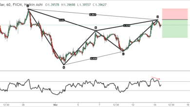 المضارب العربي / نموذج الهارمونيك Bat علي زوج GBPUSD علي الاطار الزمن الساعة, وسط غياب بيانات داعمة من الجانب البريطاني. ارتد زوج العملات الاسترليني دولار بعد بلوغه للمنطقة الانعكاس المتوقعة لنموذج الهارمونيك البيعي Bat. نتوقع استمرار الهبوط ونننصح بالبيع مع كسر لأول دعم في الحركة التصحيحية الحالية. الستوب لوز والتايك بروفيت موضحين…