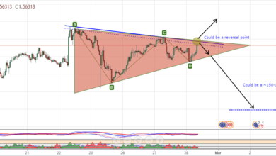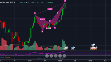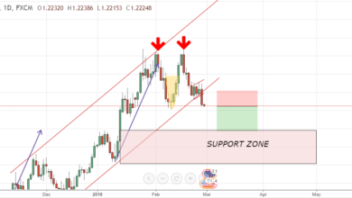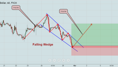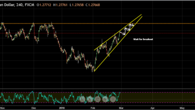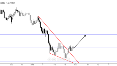 المضارب العربي / نموذج الوتد الهابط علي زوج GBPUSD كان الإسترليني قد تراجع بقوة خلال تداولات مساء أمس بسبب الارتفاع المفاجئ للدولار أمريكي، ليتحرك زوج الباوند دولار دون الدولار وتسعة وثلاثين سنتاً، وسط غياب بيانات بريطانية داعمة هبط السعر في تداولات هذا اليوم وكوّن النموذج الفني الوتد الهابط. لا نتوقع استمرار…