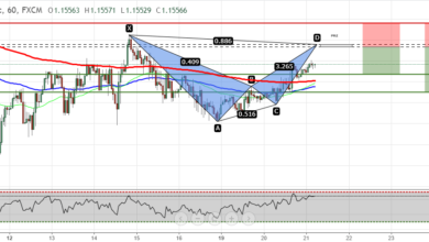 المضارب العربي / نموذج الهارمونيك Bat علي زوج EURCHF يتحرك زوج العملات اليورو فرنك في تذبذب عنيف داخل اتجاه عرضي علي فريم الساعة. نتوقع استمرار هذه التحركات خاصة مع نهاية نموذج الهارمونيك البيعي BAT ونقترح صفقة للبيع من منطثة الانعكاس المتوقعة. في حال اختراق المقاومة 1.1584 تصبح احتمالات الصعود واردة أكثر.