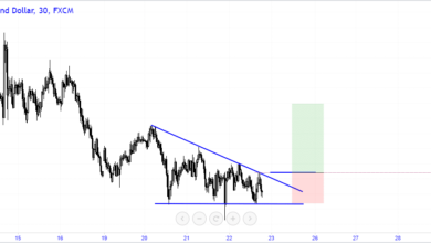 المضارب العربي / نموذج المثلث الهابط علي زوج EURNZD هبط زوج اليورو نيوزلندي خلال الأيام الماضية وبلغ أدني مستوياته عند 1.6750 ويقي يتذبذب أعلي منه مكونا النموذج الفني المثلث الهابط. نتوقع استمرار التصحيح ونقترح فرصة للشراء بناءا علي اختراق الحد العلوي للنموذج بستوب لوز وتايك بروفيت موضحين علي الشارت. يبقي سيناريو…