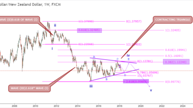 المضارب العربي / التحليل الموجي لزوج AUDNZD حسب الترقيم الموجي الموضح علي فريم الأسبوع لشارت زوج العملات الاسترالي نيوزلندي, السعر يسير في موجة هابطة دافعة بالتحديد في الموجة الرابعة التصحيحية الداخلية منها. الموجة الرابعة جائت علي شكل الموجة المثلثية المتقاطعة ct. نتوقع هبوط السعر في الموجة الخامسة بعد نهاية التصحيح الحالي.
